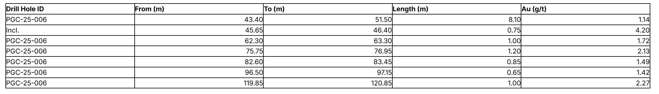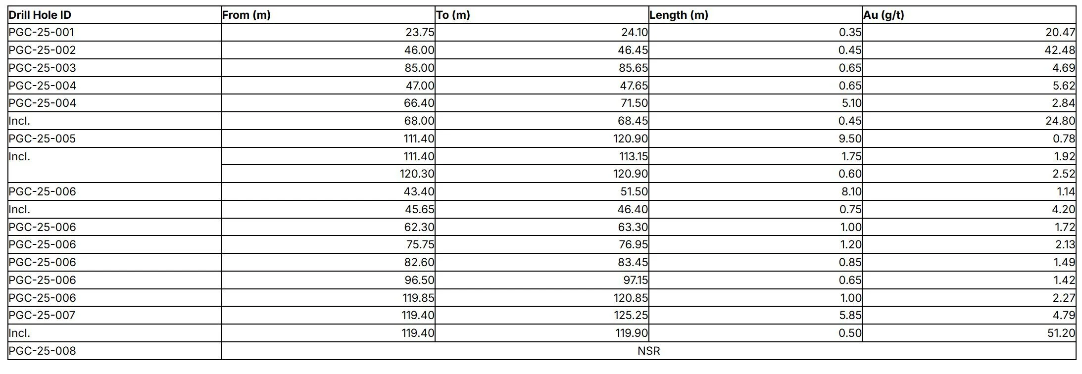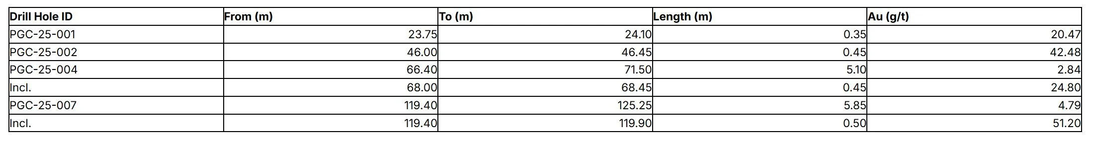 Table 4 - Significant Assays Intervals from PGC-25-001 through PCG-25-008
