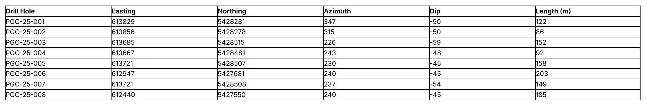 Table 3 - Drill Hole Information for PGC-25-001 through PCG-25-008