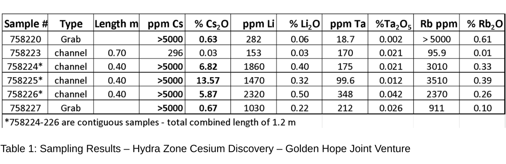 Channel sampling at the Hydra Zone returns up to 13.57% Cs2O