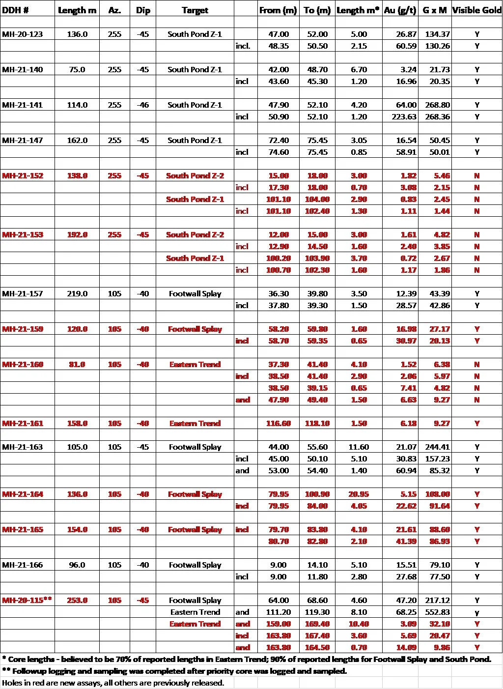 Tim Froude, President and CEO of Sokoman, says: “We are extremely pleased with the results from the Footwall Splay/Eastern Trend as they demonstrate good continuity and grade, and provide a firm foundation for additional drilling in the area from our barge-based program to begin later this summer. At South Pond, a second mineralized structure intersected in the two eastern-most holes (MH-21-152 and 153) is shallow, just 5-10 m below surface and exhibits vein mineralogy consistent with high-grade zones with visible gold encountered in earlier South Pond drill holes, as well as in other zones on the property. As we have previously seen on the property, grade variability is expected when dealing with nuggety mineralization as represented by visible gold. With 38,000 m left to drill in the ongoing Phase 6 program, and four drills on the property later this summer, we are confident we will achieve our goals of enlarging the known zones along strike and to depth and also making additional discoveries at Moosehead. As of today, drilling has resumed with two rigs, one at South Pond and the other at the Footwall Splay/Eastern Trend area.”