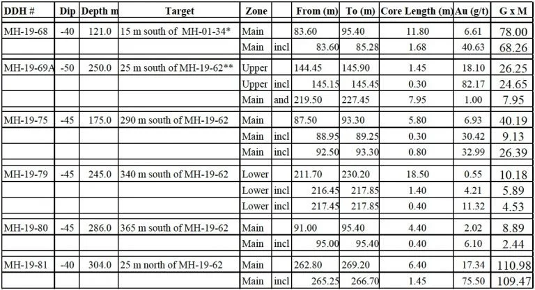 A total of 4,272 metres were drilled in 18 holes largely targeting the high-grade Eastern Trend drilled mostly from the east side of the pond. Multiple holes delivered high-grade results. MH-19-81, the final hole of Phase 4, successfully intersected the high-grade Main Zone 25 metres to the north of MH-19-62, the northernmost intersection of high-grade mineralization to date, and the zone remains open. MH-19-80, the southernmost hole drilled in the program, extended the gold bearing Eastern Trend to the south where it also remains open along strike and to depth.
