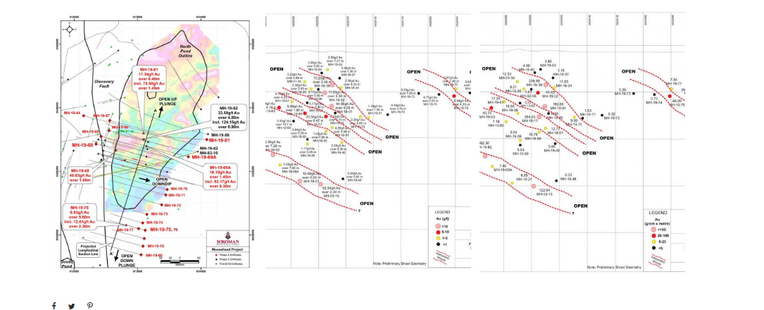 The attached long section reflects a preliminary assessment from Earth Tectonics whereby the known mineralization is interpreted to plunge to the south. This new interpretation suggests that much of our original drilling remains open and why some holes appear to have missed the zone. The ongoing structural assessment demonstrates the potential for multiple, stacked, south plunging high-grade shoots in the NE portion of the Eastern Trend, and also suggests additional high-grade shoots exist to the SW, as supported by hole MH-19-75, drilled 290 m south of MH-19-62, which intersected near surface, visible gold bearing veins typical of the high grade Eastern Trend. MH-19-75 returned a 5.80 m intersection (core length) grading 6.93 g/t Au starting at 87.50 m downhole, including two visible gold bearing veins that assayed 30.42 g/t Au over 0.30 m (from 88.95 m), and 32.99 g/t Au over 0.80 m (from 92.50 m).