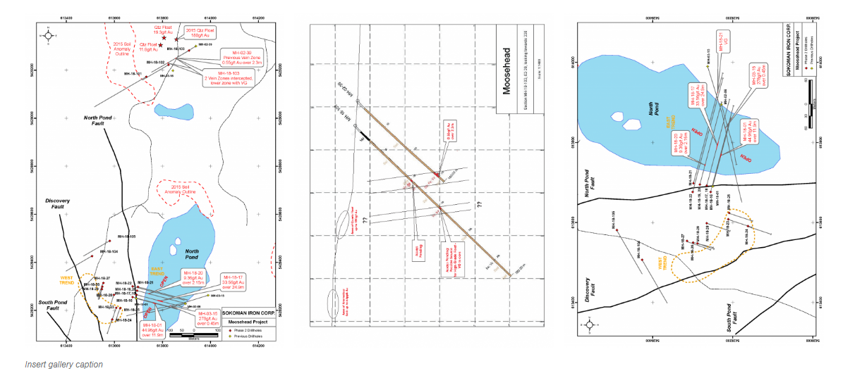 The Phase 2 drilling also indicates that the Eastern Trend mineralization appears to be moderately north to northeast dipping, not a subvertical, west dipping structure as initially thought. This new structural interpretation also suggests that the Eastern and Western trends may be linked, with deformation and therefore gold mineralization, stronger in the Eastern Trend area. The idea of this linkage was initially proposed in a structural report on the Moosehead property by previous operators in 2016. Seven holes totaling 777 metres have been completed in the Western Trend following up on results from Phase 1 that included 2.28m grading 42.36 g/t Au from MH-18-08 (Sokoman News Release August 29, 2018).