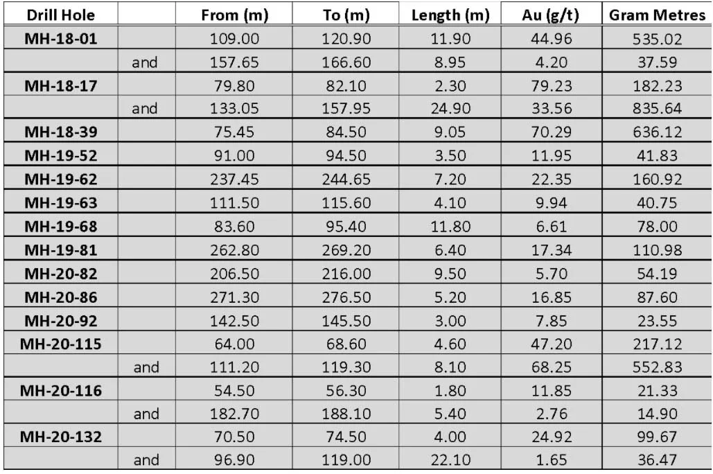 MH-21-115 (Footwall Splay – Eastern Trend) – 4.60 m @ 47.20 g/t Au; and 8.10 m @ 68.25 g/t Au
