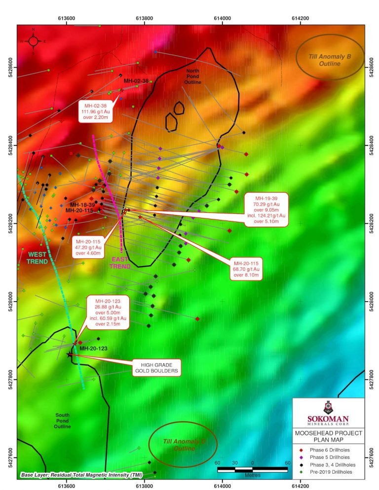 St. John’s, NL, January 19, 2021 – Sokoman Minerals Corp. (TSX-V: SIC) (OTCQB: SICNF) (“the Company” or “Sokoman”) is pleased to announce that drilling operations have re-started with the first of two rigs at the high-grade Moosehead Gold Project in central Newfoundland. Initially the focus will be on further defining and expanding on areas of high-grade gold mineralization in the northern portion of the Eastern Trend, proximal to historical hole MH-02-38 that intersected a broad zone of gold mineralization from 76.38 m to 88.22 m, highlighted by a 2.02 m intercept grading 111.96 g/t Au from 83.82 m downhole. MH-02-38 lies approximately 300 m north of MH-20-115 that returned two zones of high-grade gold including 4.60 m @ 47.20 g/t Au, now known as the Footwall Splay, as well as a slightly deeper intersection from the Main Eastern Trend that returned 8.10 m @ 68.25 g/t Au (November 19, 2020 NR). Modelling suggests that the intersection in MH-02-38 could represent a splay off the main Eastern Trend similar to the upper intersection in MH-20-115. The rig will be coring HQ size core (63.5 mm diameter core versus 47.6 mm for NQ core) to maximize capture of free gold in the high-grade vein zones.