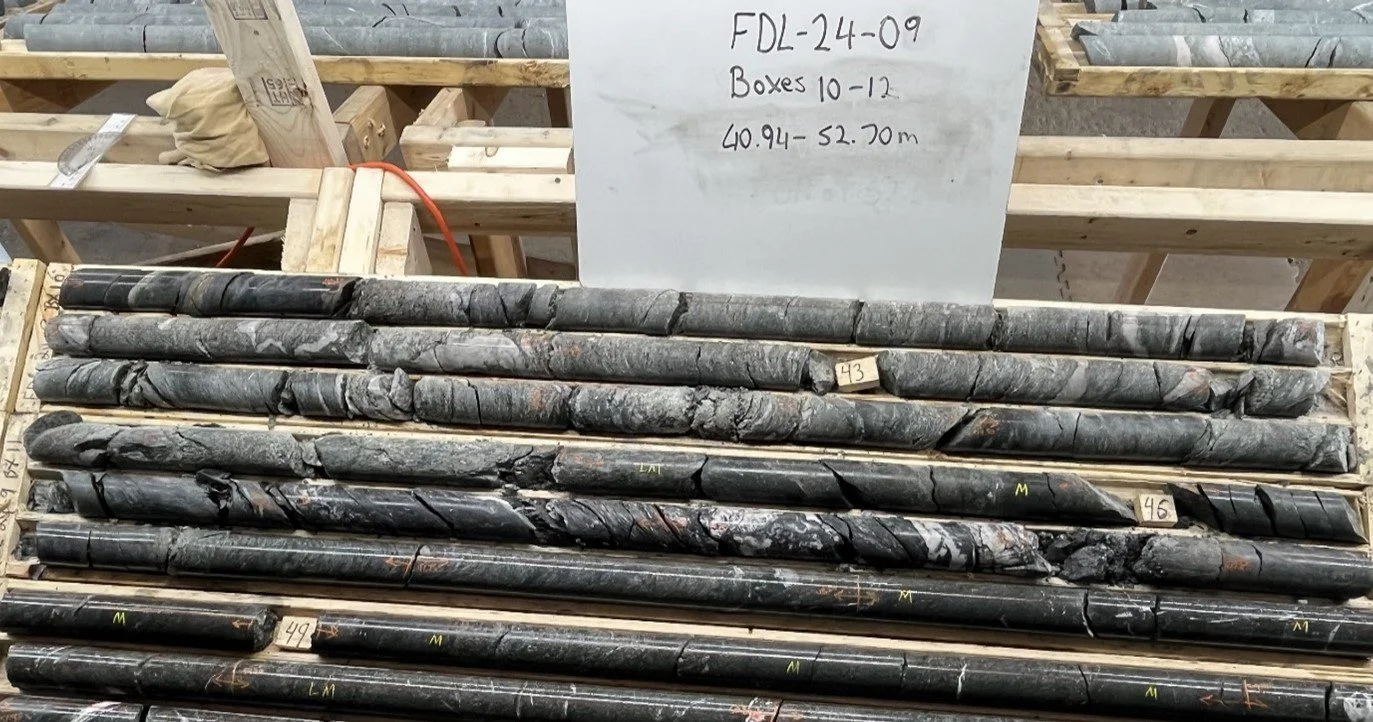 Holes FDL-24-01 to FDL-24-04 tested quartz breccia zones 2 km southwest of the Golden Bull Prospect target area and that gave anomalous gold values up to 2 g/t Au from random rock grab (outcrop and float) samples in 2022 and 2023. No previous drilling tested the zones. All four holes intersected sheared / locally brecciated psammitic schists with variable quartz veining and 1%-2% disseminated pyrite over core lengths of 0.5 m to 4.0 m (true thickness approximately 90% of core length).Drill holes FDL-24-05 to FDL-24-08 tested geophysical / soil geochemical targets underlain by a strong north-trending structural corridor, originally defined by Noranda in 1988 but never tested. Two of the holes (FDL-24-07 and 08) intersected quartz veining with variable sulphide (1%-3% disseminated pyrite and pyrrhotite) over 2.9 m to 10.0 m core length (true thickness 80% of core length).