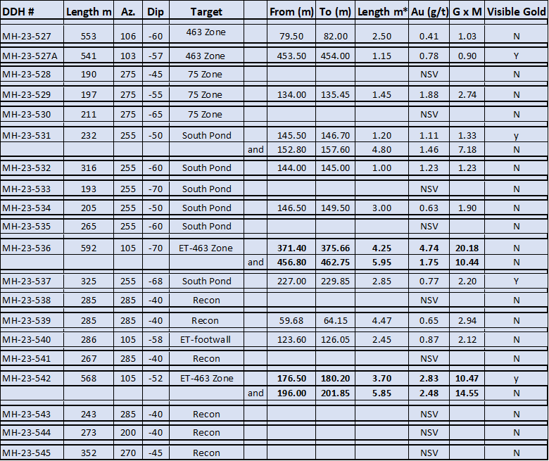Drill holes MH-23-536 and 542 were drilled to follow up a 1.4 m intersection of visible gold-bearing quartz veins that gave 12.41 g/t Au from 409.75 m downhole (see the April 13, 2023 news release) an 80 m step-out, 56 m down plunge, from MH-22-463 in the 463 Zone. Results indicate that the zone remains open down-plunge. Other holes testing the 463 Zone area returned only anomalous results.