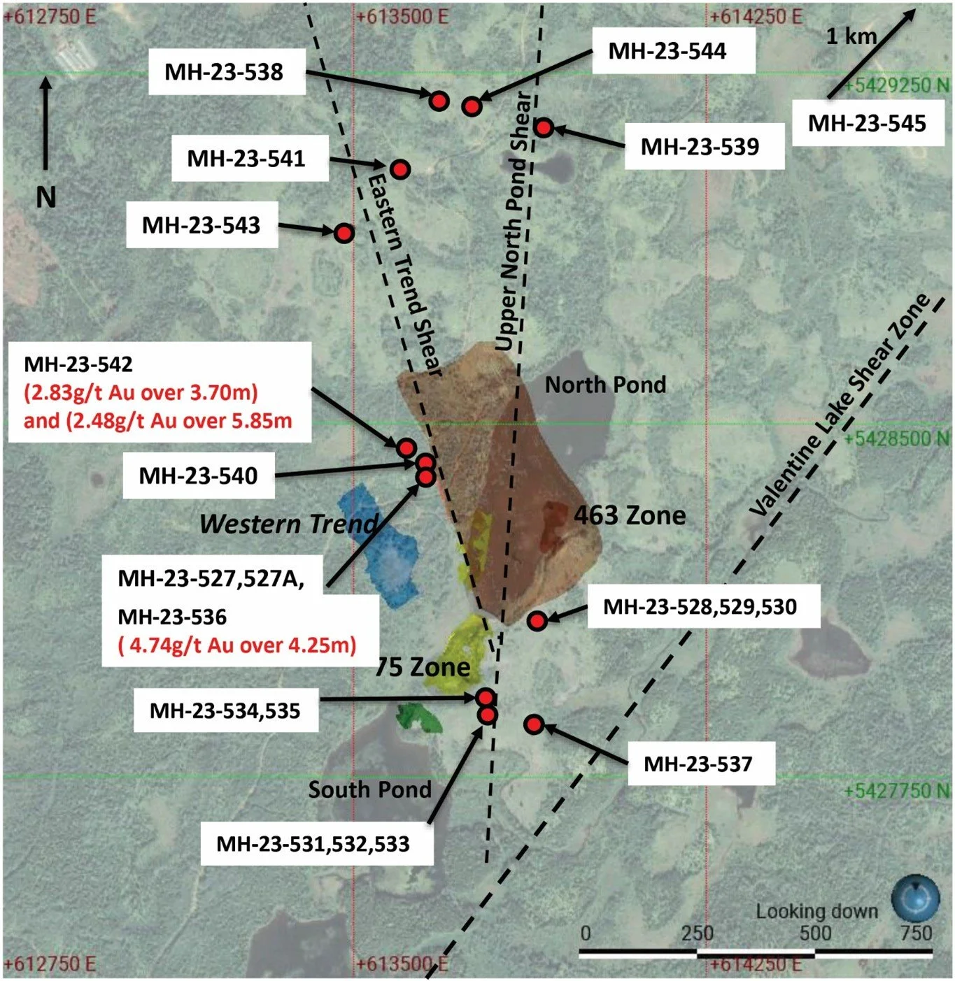 The table below gives the drill results for the 463, South Pond, and 75 Zones and also several reconnaissance holes.