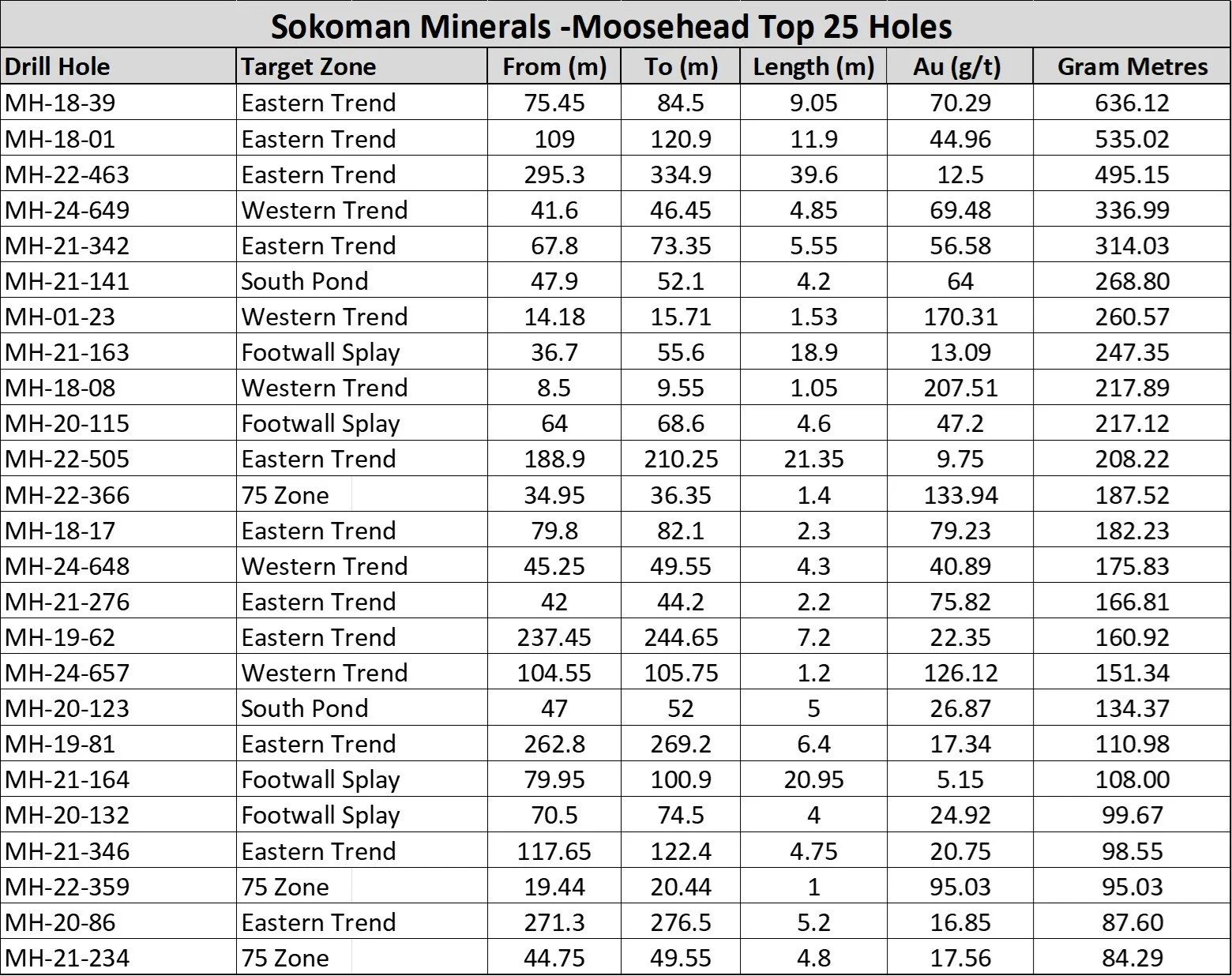 St. John’s, NL, September 12, 2025 – Sokoman Minerals Corp. (TSXV: SIC) (OTCQB: SICNF) (“Sokoman” or the “Company”) is pleased to announce that diamond drilling will resume at the 100%-owned Moosehead Gold Project in central Newfoundland. The initial focus will be a series of deep, 1,000 m depth, downhole drill holes testing the Eastern Trend and Western Trend gold zones for depth extensions, as well as testing for undiscovered parallel zones. Since 2018, a total of 135,325 m of core in 672 drill holes, across the property, have resulted in the definition of five significant zones of gold mineralization and several smaller, less defined zones, with most remaining open for expansion. All the main gold zones have high-grade intersections of at least 100-gram metres of gold to a maximum of 636.12-gram metres from MH-18-39. Please see the table of Moosehead’s Top 25 Holes below.