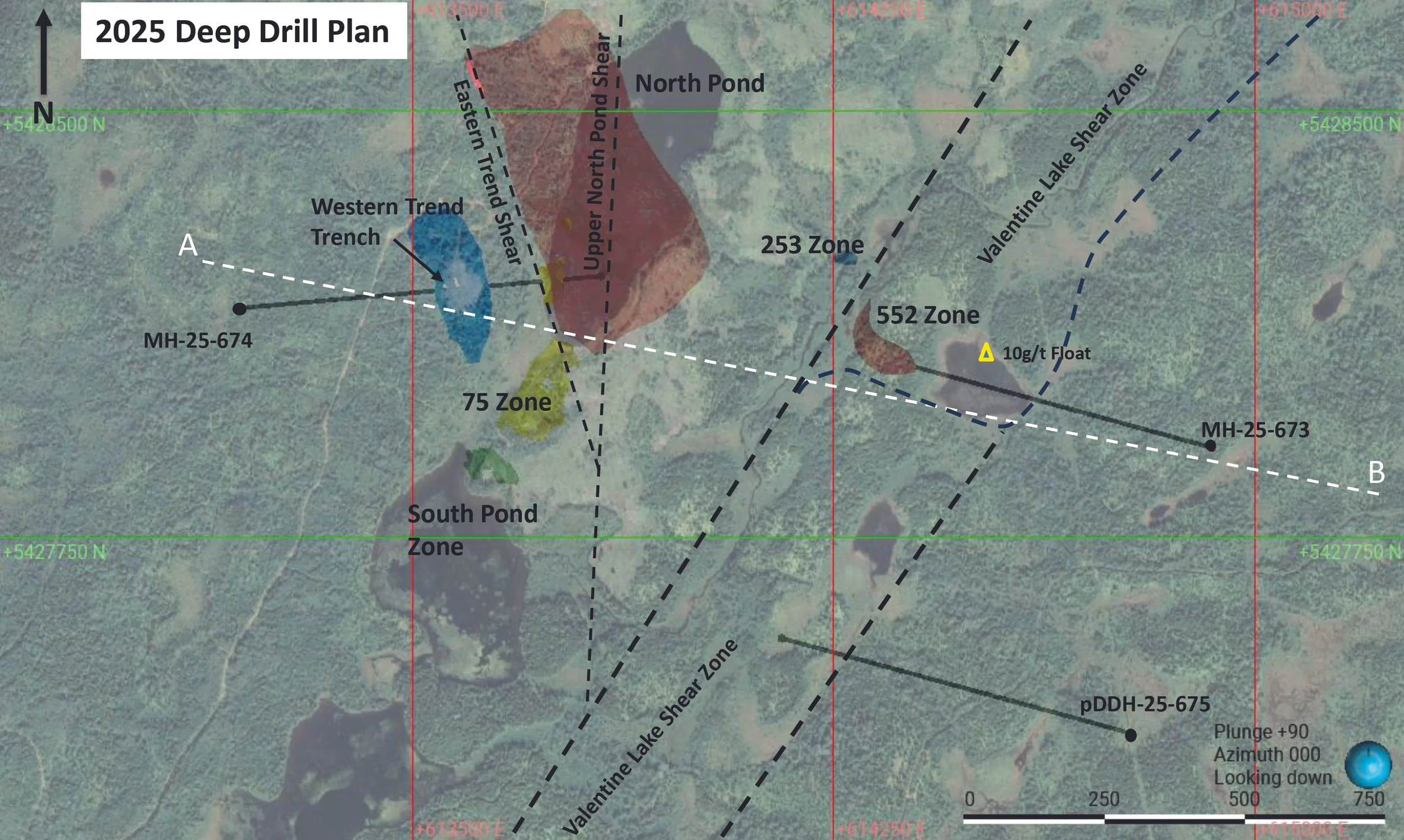 The first deep hole, MH-25-673, will be the most easterly hole drilled, testing from east to west the deep regional structures of the Eastern Trend and zones proximal to it. The drill hole will test the full width of what is believed to be the Valentine Lake shear zone, and will extend through the inferred southeastern projection of the Eastern Trend at a planned vertical depth of 650 m. The initial 200 m to 300 m will test ground with no previous drilling, where an unsourced 1988 float sample assayed 10 g/t Au.